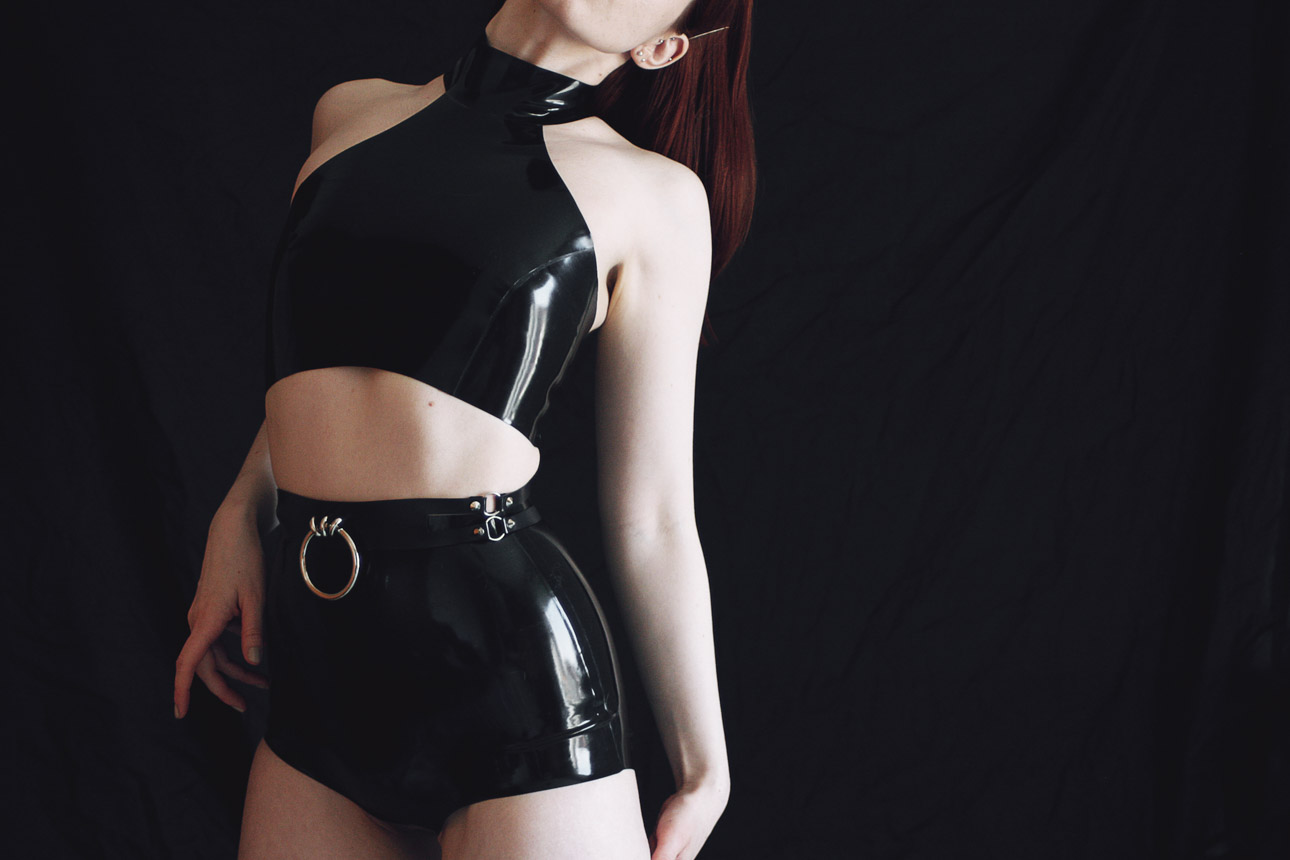 The top is a halter that fastens with press studs behind the neck. It has a bust measurement of 32″ and fits a teeny tiny bit loosely over my shallow bust but thanks to the style of the top it’s not overly noticeable. I ordered the standard size but Wilde does offer custom sizing. If I was to go back for the Bliss Body which I also have my eye on, I’d definitely ask for custom sizing to avoid bagging. While I’ve never had any experience of latex other than Sasha Louise’s Glydetex, I was aware that talc can act as a dressing aid and so I tried the top on using only the layer of talc it came with. It went on fairly easily (although much easier the second time when using a silicone lubricant) and fits comfortably. While I initially thought that latex wasn’t that wearable the top definitely feels like it could be worn for a night out thanks to it’s simple style.