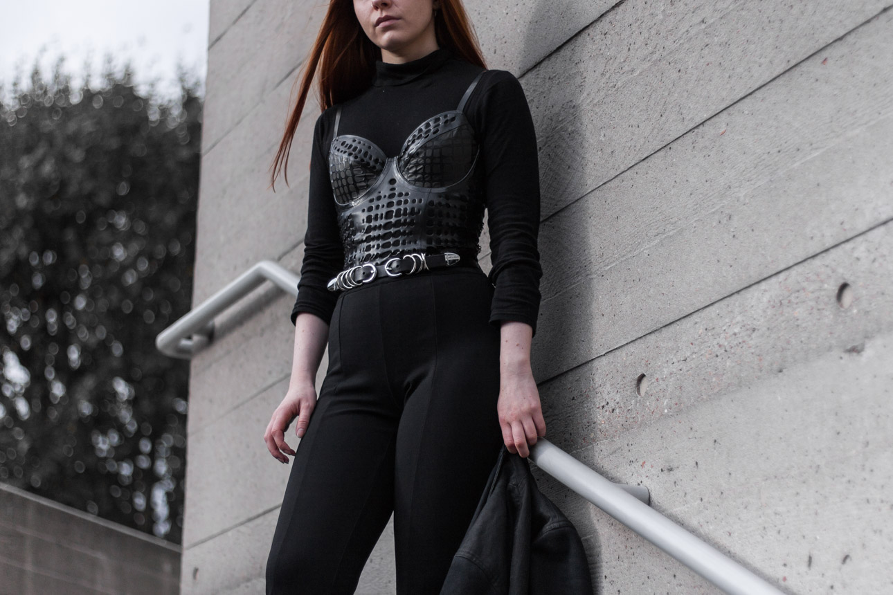 Until I can fully curate my wardrobe into the lingerie goth collection of my dreams, I’ve been experimenting with what I already own. After collaborating with Sasha Louise last year, she gifted me this bodysuit as part payment and it has sat in a drawer ever since. So I whipped it out recently, determined to make it work for outerwear. Combined with the opaque jersey roll neck and Creepyyeha belt, I love how the outfit gives a subtle nod to fetish wear while still being appropriate for the dreary Scottish weather.